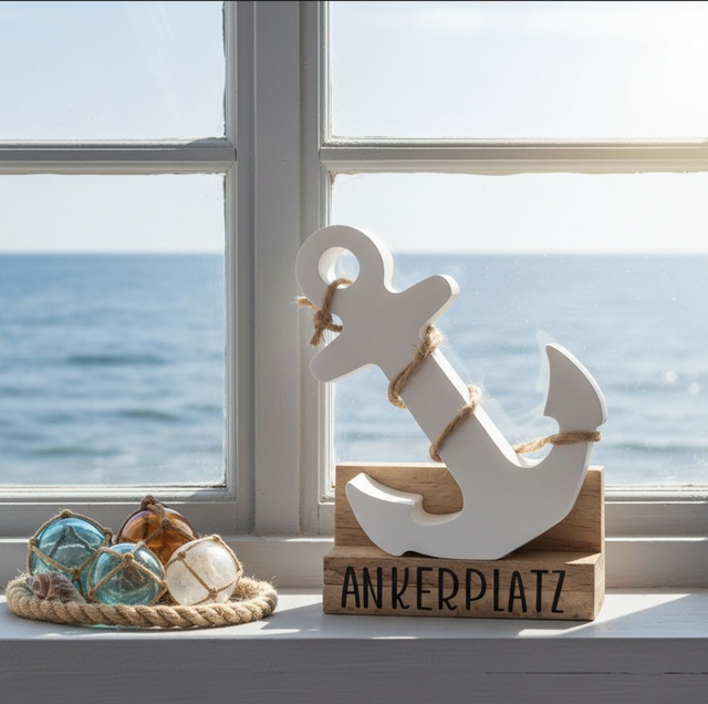 Dieser wunderschöne Anker aus Raysin mit Sisalseil umwickelt ist auf einem Holzsockel befestigt. Dieser ist mit schwarzer Vinylfolie beplottet. Der macht sich als maritime Deko wirklich überall sehr gut.