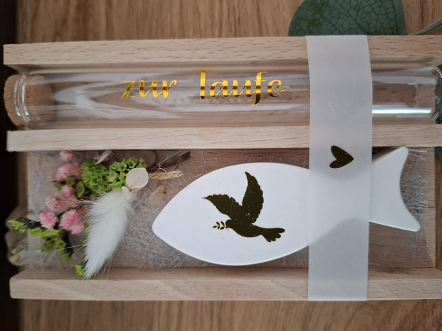 Auf dem Reagenzglas, für Geldscheine, steht aus goldfarbener Vinylfolie "zur Taufe".