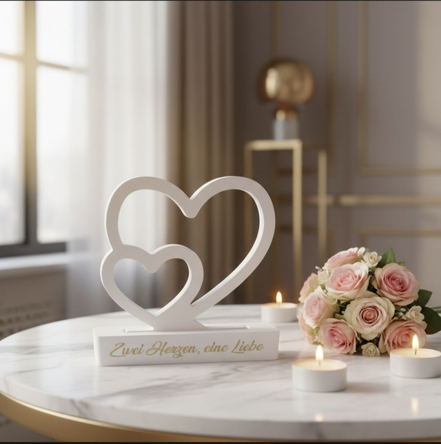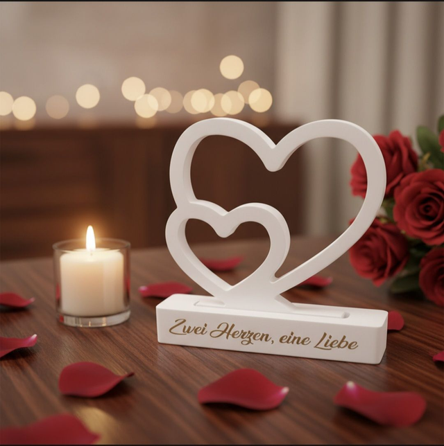 Ihr seit auf einer standesamtlichen Trauung eingeladen und braucht noch ein kleines Geschenk? Dann wäre das hier genau das Richtige. Ein Aufsteller mit zwei verbundenen Herzen. Beides aus Raysin gegossen. Als stilvolles Andenken an einen wunderschönen Tag, macht sich diese Deko in jeder Vitrine gut.