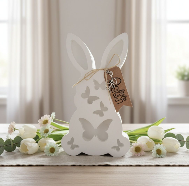 Dieser wunderschöne Hase mit Schmetterlingsmuster aus Raysin kann mit einem Ballonlicht beleuchtet werden. Somit ist diese Deko auch ein richtiger Hingucker, wenn es dunkel ist. Dann kommen die Schmetterlinge noch besser zur Geltung. Das Ballonlicht wird angeschaltet und in den Hasen gelegt.